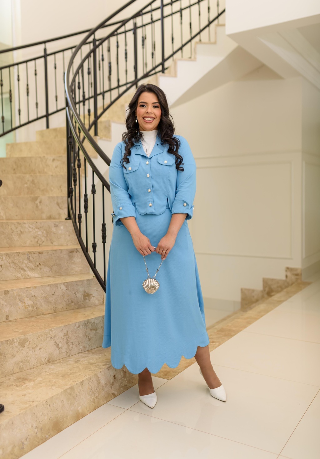 A saia midi complementa o conjunto com um barrado nuvem e um cos alto com elástico atrás, proporcionando conforto e ajuste. A modelagem evasê e os bolsos funcionais trazem praticidade e estilo ao seu look.